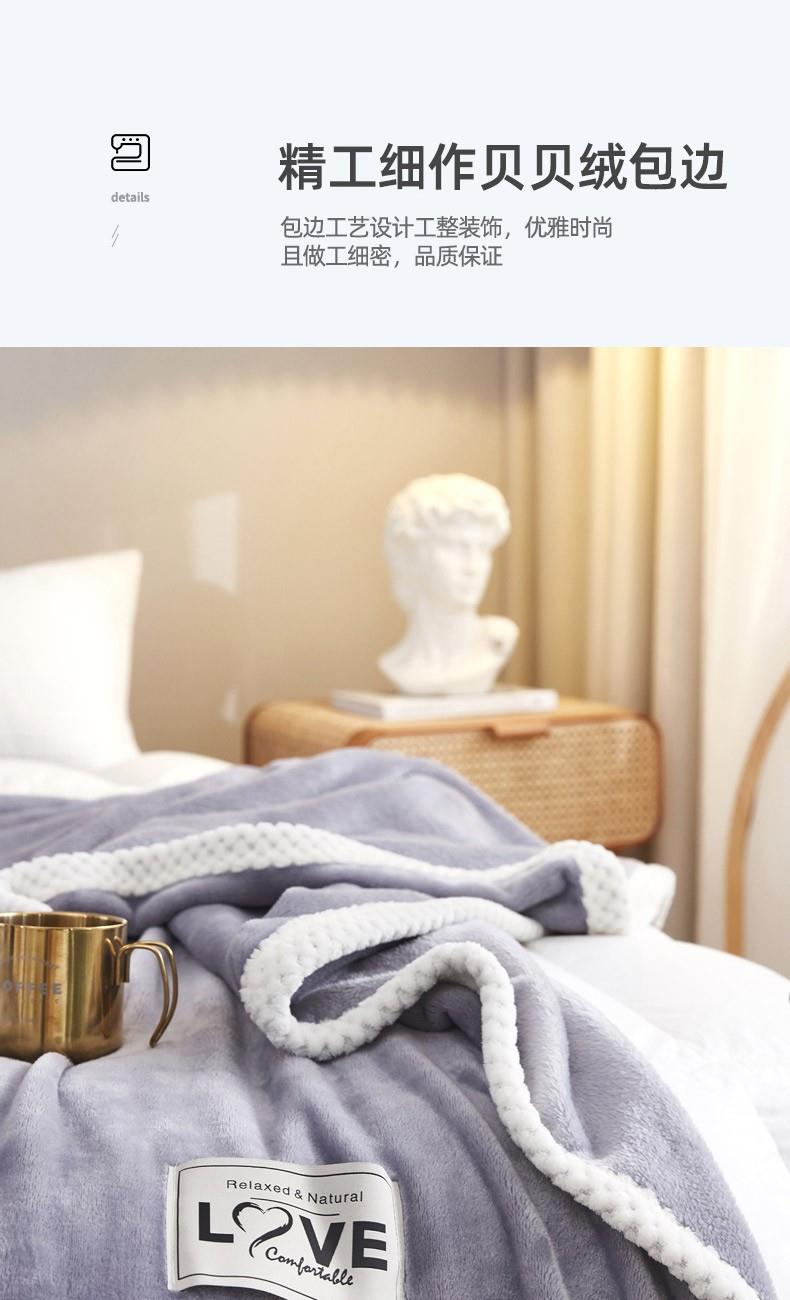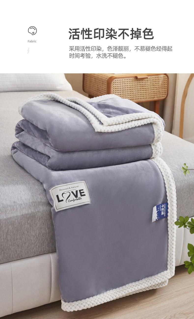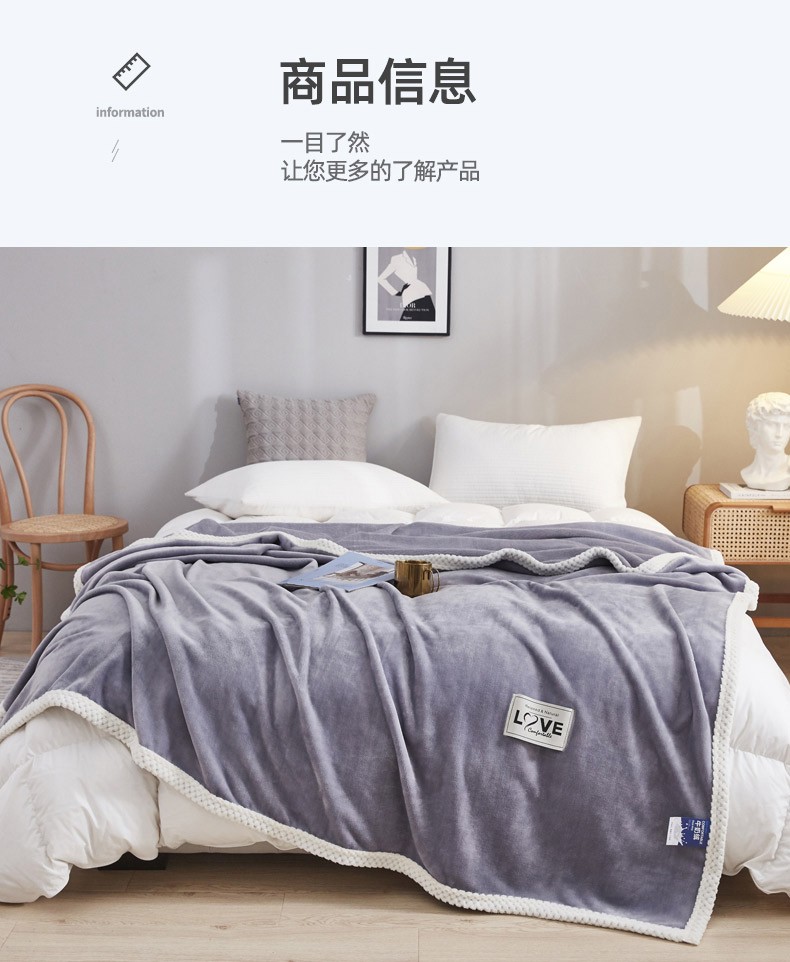 面料:牛奶絨(聚酯纖維) 邊料:貝貝絨 規(guī)格:180cm*200cm 牛奶絨是一種新型保暖纖維,具有保暖蓄熱功能,絨面豐盈,手感細(xì)膩絲滑,采用活性印染,色澤靚麗,不退色,不掉毛屑,精細(xì)做工采用貝貝絨包邊工藝,做工細(xì)密整齊,一毯多用,適用辦公居家環(huán)境,四季皆宜。