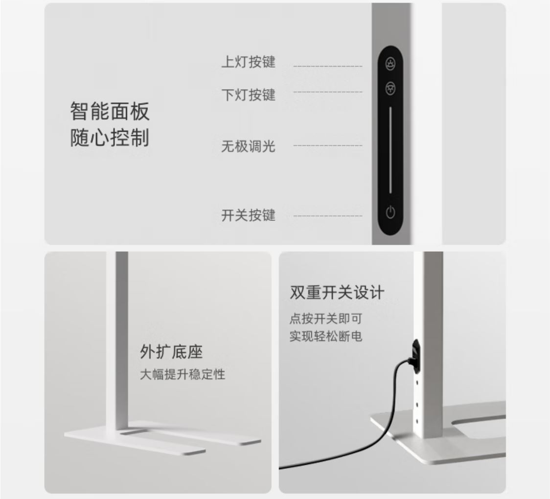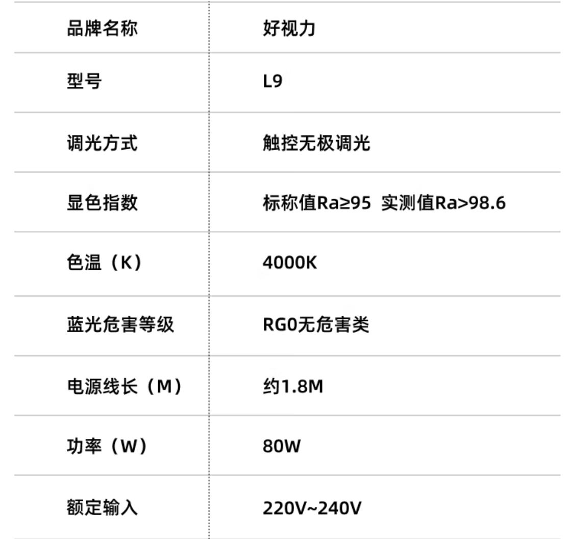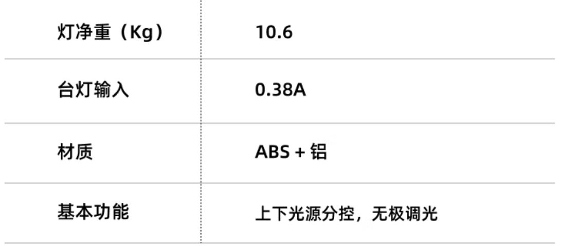 調(diào)光方式:觸控?zé)o極調(diào)光 顯色指數(shù):標(biāo)稱值Raz95 實測值Ra>98.6 電源線長(M):約1.8M 功率(W):80W 額定輸入:220V~240V 燈凈重(Kg):10.6 臺燈輸入:0.38A 材質(zhì):ABS+鋁 基本功能;上下光源分控,無極調(diào)光