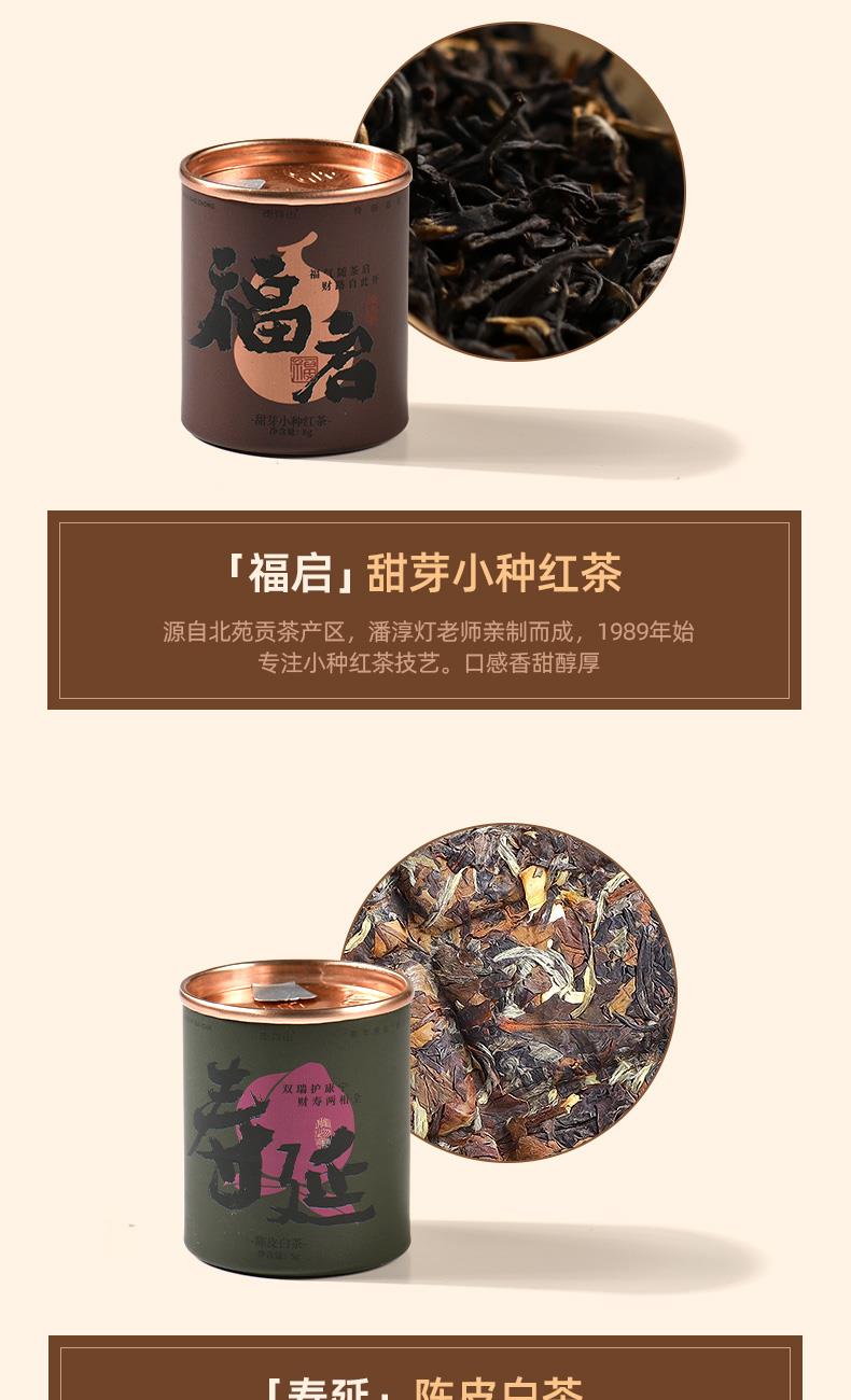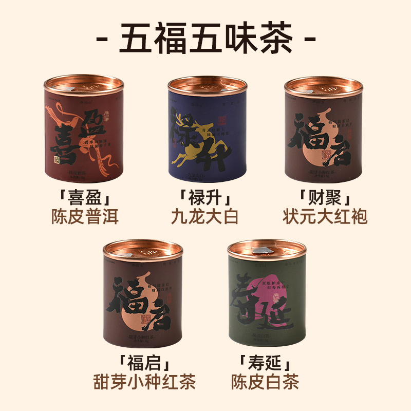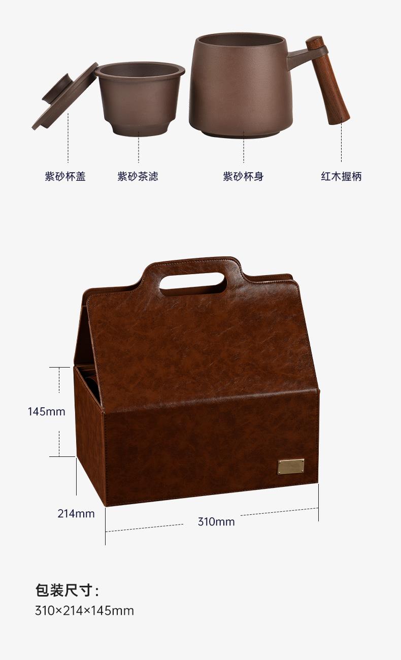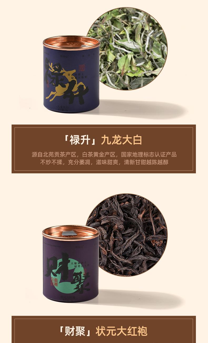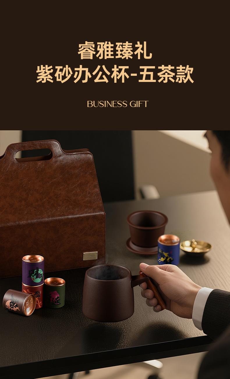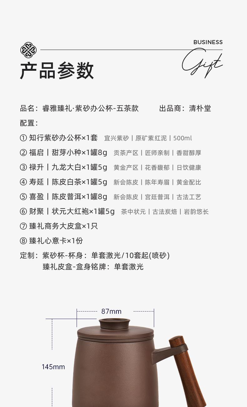 配置 · ① 知行紫砂辦公杯×1套 【宜興紫砂丨原礦紫紅泥丨600ml】 ② 福啟丨甜芽小種×1罐8g 【貢茶產區(qū)丨匠師親制丨香甜醇厚】 ③ 祿升丨九龍大白×1罐5g 【黃金產區(qū)丨花香馥郁丨日飲健康】 ④ 壽延丨陳皮白茶×1罐5g 【新會陳皮丨陳年壽眉丨黃金配比】 ⑤ 喜盈丨陳皮普洱×1罐8g 【新會陳皮丨宮廷普洱丨古法工藝】 ⑥ 財聚丨狀元大紅袍×1罐5g 【茶中狀元丨古法炭焙丨巖韻悠長】 ⑦ 臻禮商務大皮盒×1只 丨 ⑧ 臻禮心意卡×1份
